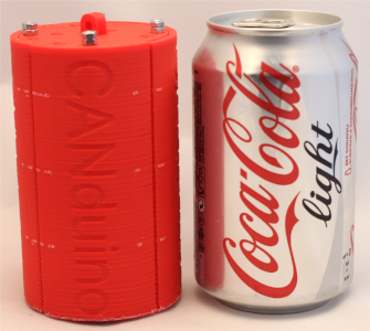 CANduino is based on the requirements of EUROPEAN CANSAT COMPETITION. The size of the can is 115 mm in height and 66 mm in diameter with additional space of 45mm in height above to fit additional payload, antennas and a parachute. Weight of CANduino itself is 200g while allowed weight for CANsat is 300-350g. So there is weight reserve for additional payload or ballast.